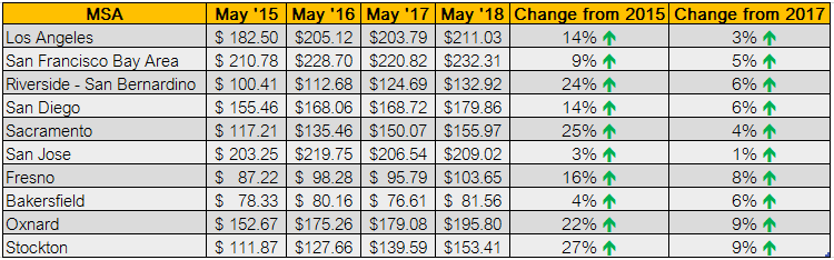 Here, we look at the year-on-year trends over the last four years in the top ten California MSAs. The data shows a steady increase in average rates across all MSAs and unit types (with a minor exception for smaller units, 5×5 non-climate controlled, in the San Jose, San Diego and Bakersfield MSAs). The Riverside, Sacramento, Oxnard and Stoctock MSAs have all seen a rate increase of 20 percent or more across all units since 2015, while 7 of the top 10 MSAs have seen an increase in rates of 5 percent or higher in at least one unit type in the last year.
