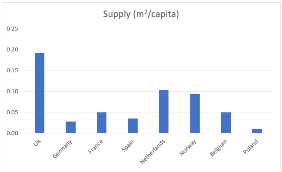 The total net rentable square footage (NRSF) in the UK is estimated at around 103 million sqft, or roughly 0.20 sqft/capita.