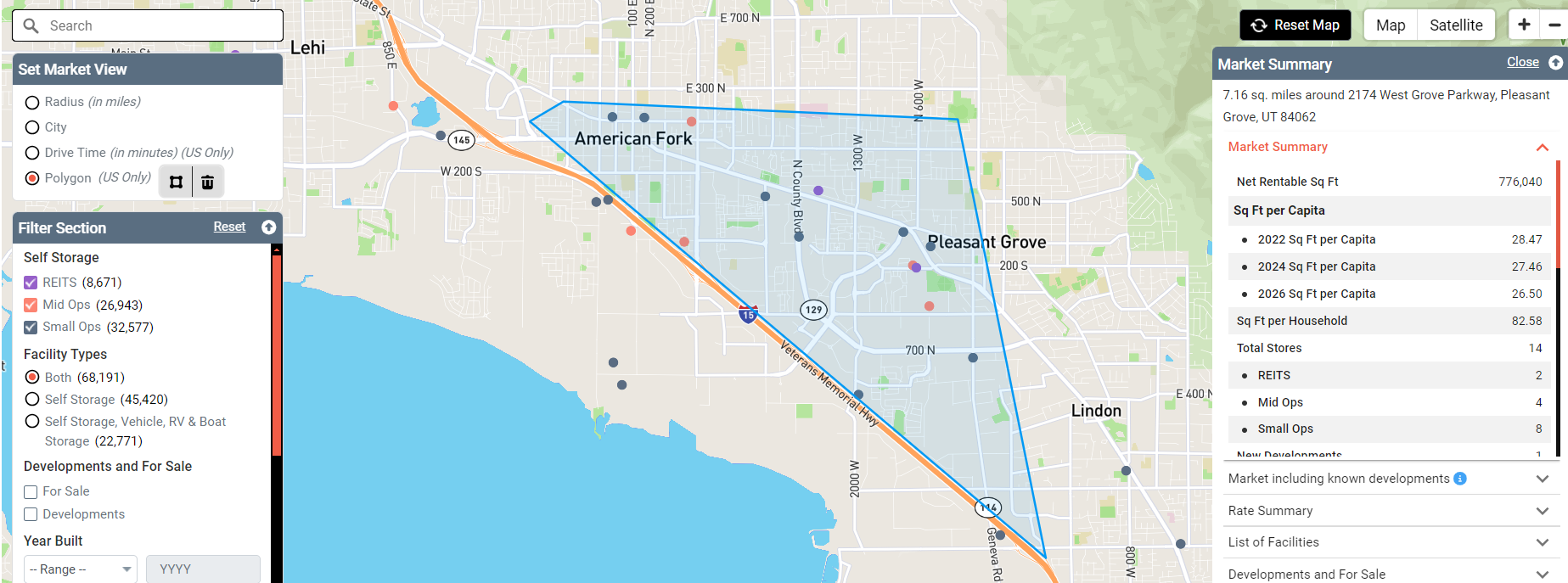 By using Explorer’s polygon tool to draw the market more precisely, operators and investors can gain a more accurate, granular analytics on square footage per capita, net rentable square footage, population, average rental rates, competitor count and more. This provides a better understanding of the competitive landscape, demographic trends, and potential customer base, while also excluding non-developable areas like rivers and lakes. Additionally, it helps identify opportunities and challenges specific to the area, aiding in risk assessment and investment planning.