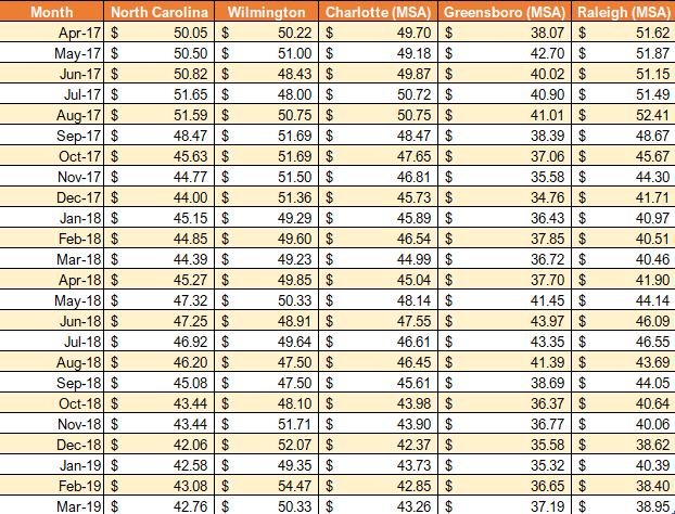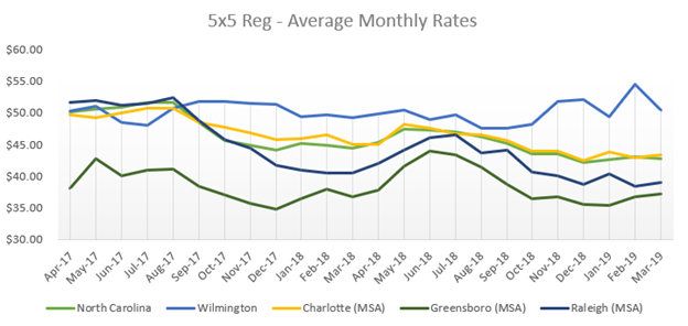 Not surprisingly, the average rates for North Carolina as a state are lower than the the top MSAs although rates have trended downward consistently across the state and all MSAs with the exception of the Wilmington region. The trend in decreased rates across the state could be attributed to the growing supply of new facilities. In the Wilmington region rates have increased dramatically in recent months, showing the impact the lack of supply, especially after the devastation of the recent hurricane, has had in the region.
