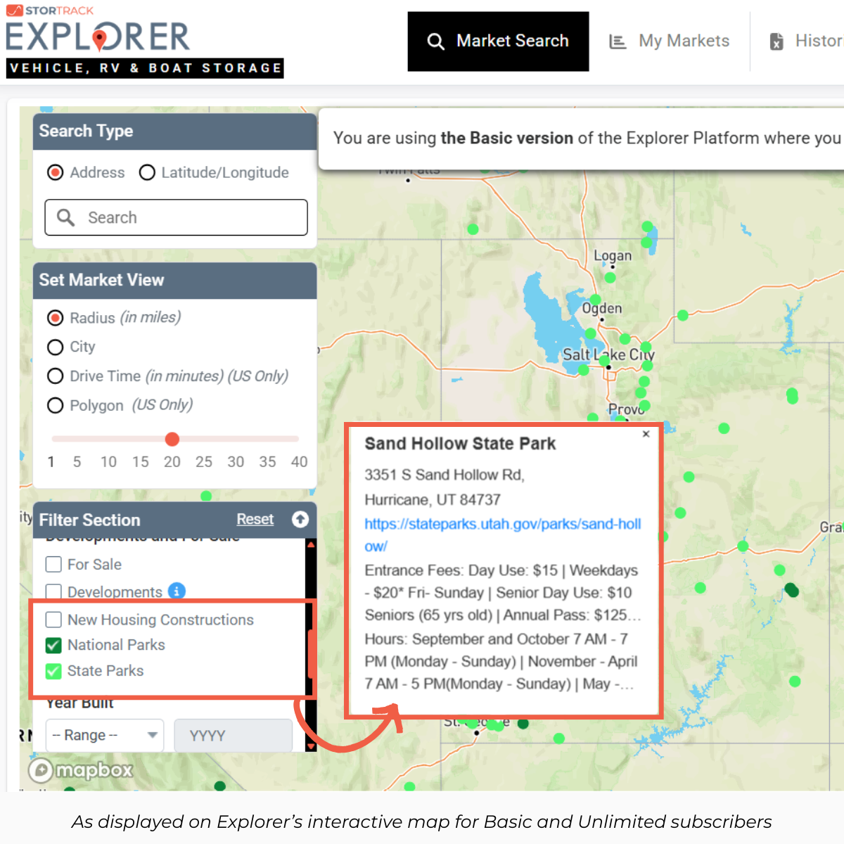 We’ve added a new layer to the interactive map that now displays the location of all 63 U.S. national parks and over 2,400 state parks. This feature is now live for all U.S. Basic and Unlimited subscribers of the Explorer platform and provides critical geographic context for anyone looking to invest, develop, or acquire a facility in this specialized segment of the storage market.
