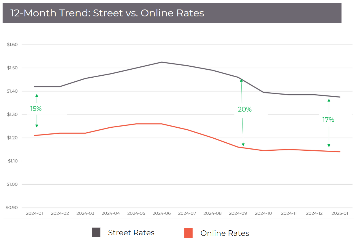 Rental rates have shown a slight dip over the past month, but the year-over-year (YoY) trend paints a more pronounced picture. Street rates have declined 2.5% to $1.38/sf, while online rates have fallen 5.4% to $1.14/sf, signaling an increasingly aggressive digital pricing approach. At their peak in Q3 2024, online discounts reached 20% before settling at an average 17% discount – a higher level than the previous year and part of a steady upward trajectory over the past three years . These trends highlight the growing importance of digital-first pricing strategies, as operators adjust incentives to attract tenants in a price-sensitive environment.