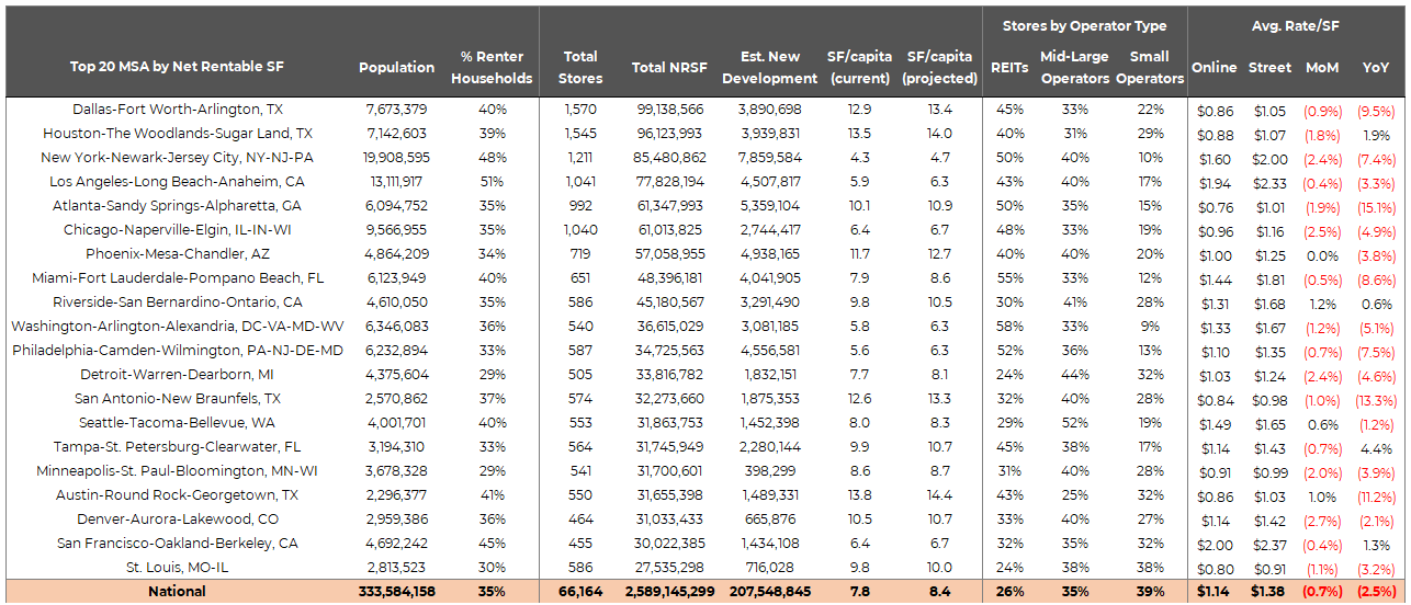 The top 20 MSAs account for 38% of the nation’s total NRSF, with Dallas and Houston leading the market, each surpassing 90 million square feet. Pricing trends across these key markets vary significantly, shaped by supply growth, demand drivers, and competitive pressures. While some MSAs remain undersupplied, supporting stable or rising rates, others face pricing declines due to increased competition and ongoing new development. Nationally, street rates have fallen 0.7% month-over-month (MoM) and 2.5% year-over-year (YoY), reflecting the broader impact of supply-demand imbalances.