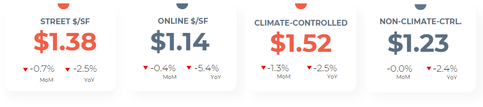 Climate-controlled (CC) units saw a 1.3% decline in pricing over the past month, likely due to reduced seasonal demand during colder months, while non-climate-controlled (NCC) units remained stable at $1.23/sf. Over the past year, both CC and NCC unit rates declined by 2.4%, mirroring the broader downward trend in street rates.