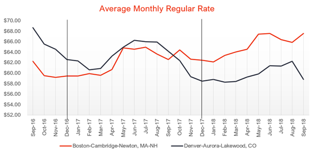 In the last year, the Boston-Cambridge-Newton MSA, the 10th largest MSA in the U.S., saw the biggest year-on-year increase in average small unit rates in September 2018 (compared to the same month last year). At the other end of the spectrum was Denver-Aurora-Lakewood with the largest decrease in average rates on the same month last year. In comparison, our analysis last year showed the Riverside and Chicago MSAs with the biggest increase and decrease, respectively.