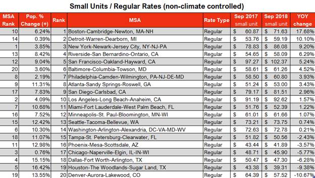 We analyzed rates for regular small units (units sized up to 6×6 and without climate control). A comparison of year-on-year Regular (or ‘walk-in’) rates for the top 20 MSAs is shown below, along with MSA population change over the last 10 years: