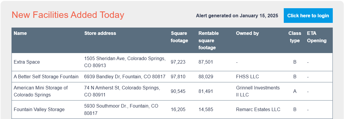 • New Self-Storage Facilities – Be the first to know when new self-storage locations open, helping you track expanding markets and new competition.