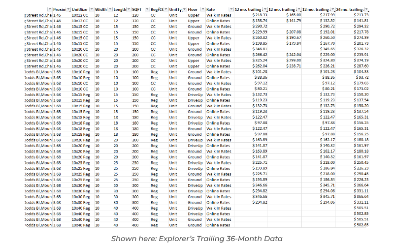 • Trailing 12-Month Data Report: View 12 months of pricing data for all unit types, broken down by current, walk-in, and online rates.